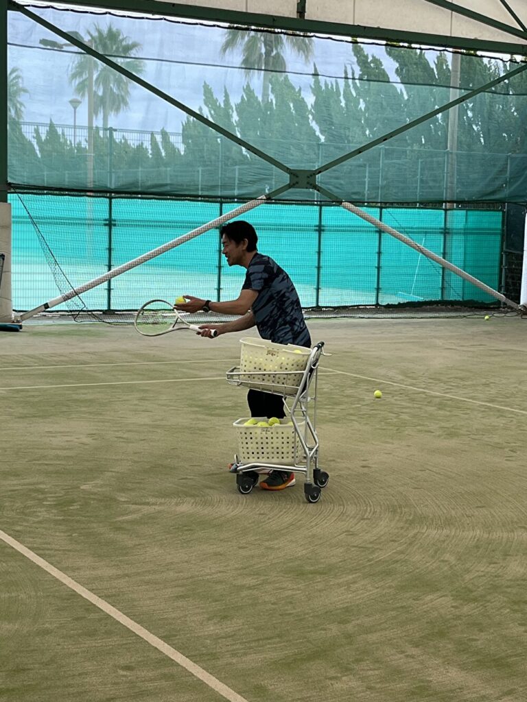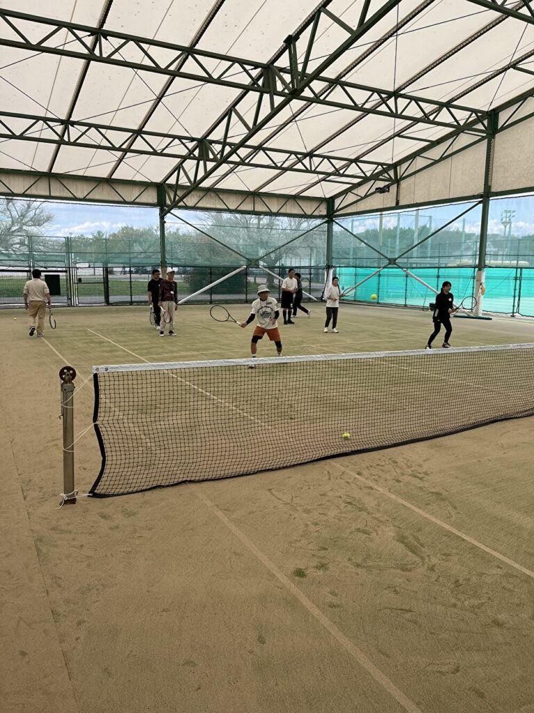 レンタルコート屋内2面、屋外1面の計3面を借りて、楽しく練習。今回は少人数でもあり、コーチを引き受けていただいた蒲池大治郎プロの